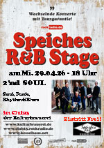 | Mo 04.05. | 19.00 | Konzert Ort: Speiche |  | Speiches Open Stage - Speiches Acoustic Monday - mit Steffen Siegmund - Musicians Welcome! Folk,Blues,Soul,Jazz,Country,SingerSongwriter...jeden Monta |